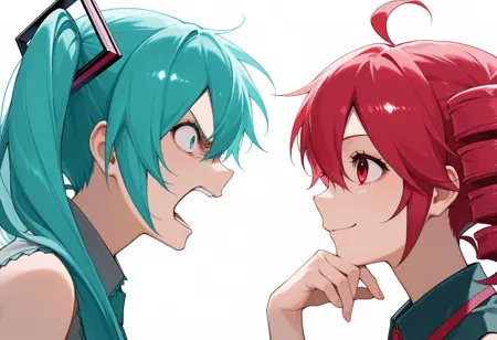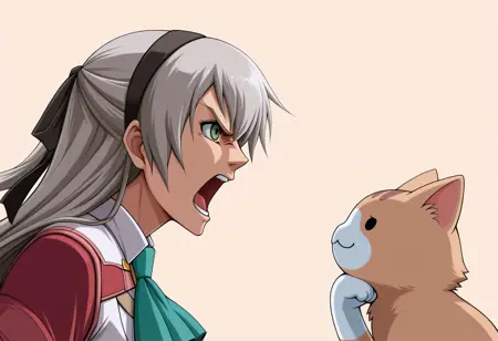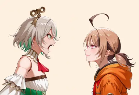 触发词:大喊、侧脸、上半身、侧面像、<角色1>、张嘴、<角色2>、闭嘴、微笑、手放在自己的下巴上