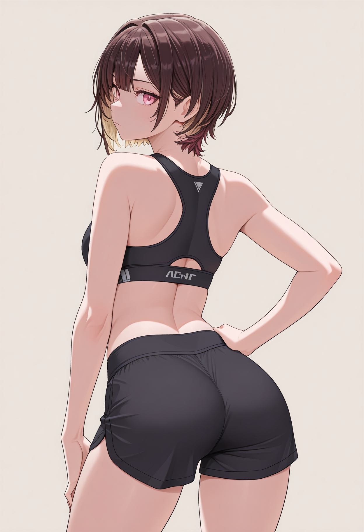 pink eyes, brown hair, colored inner hair, blonde hair, short hair