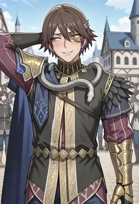 | トレーニングワード | kzinssie, short hair, black hair, half eye maskコピーしました! asymmetrical clothes, black jacket, purple shirt, turtleneck, gold trim, snake necklace, single pauldron, gold pauldron, single glove, elbow gloves, black gloves, side cape, dark blue cape, feather trim, black feathers, single gauntlet, gold gauntlets, dark blue pants, gold greaveコピーしました! |