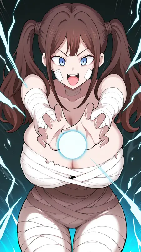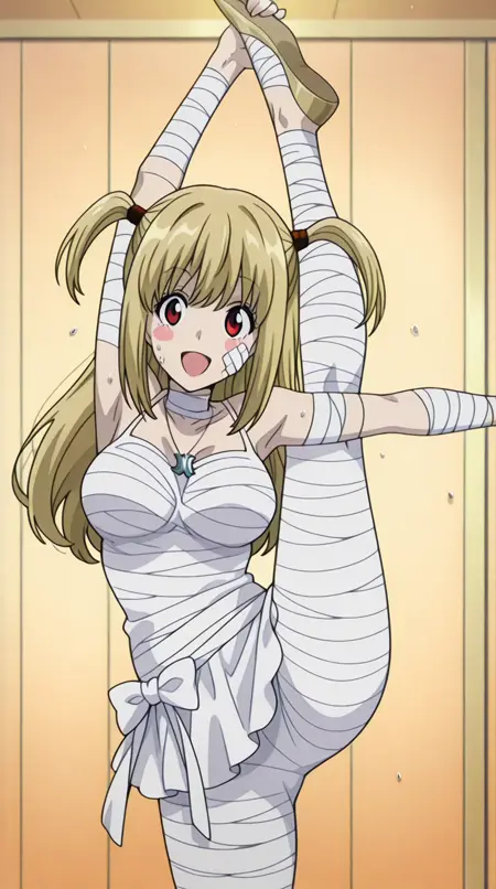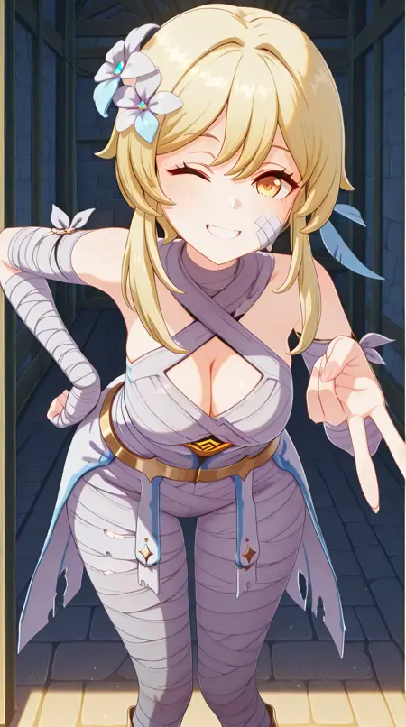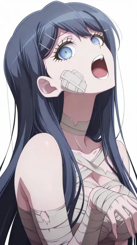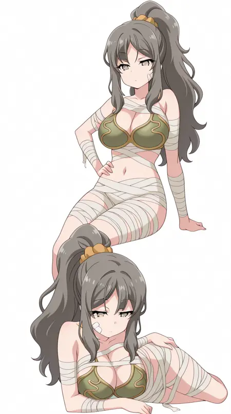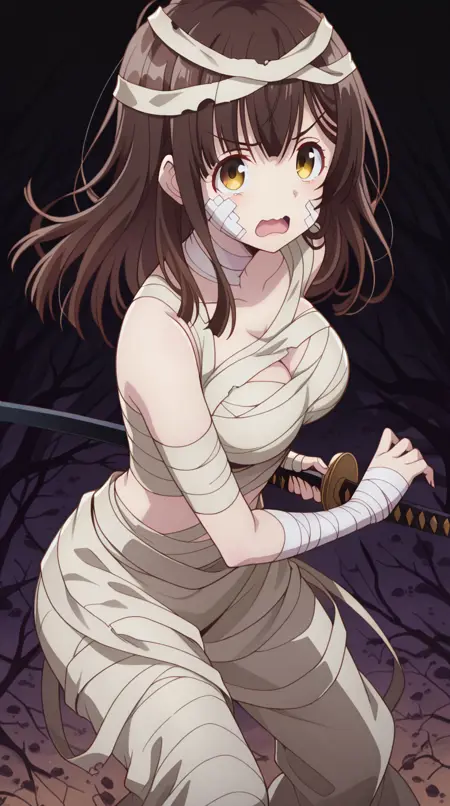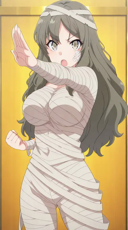 lora:mummy-costume-illustriousxl-lora-nochekaiser:1,木乃伊服装,单人,绷带,万圣节服装,绷带手臂,僵尸姿势,脸上缠着绷带,