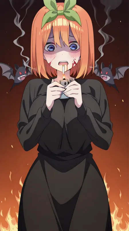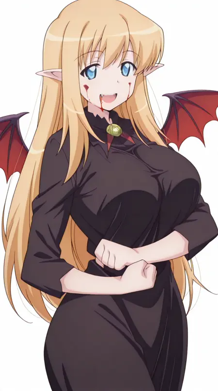 lora:vampire-illustriousxl-lora-nochekaiser:1, vampire, red eyes, pointy ears, fangs, black dress, wings, blood, blood on face, blood on mouth, bat (animal), halloween, halloween costume, upper teeth only