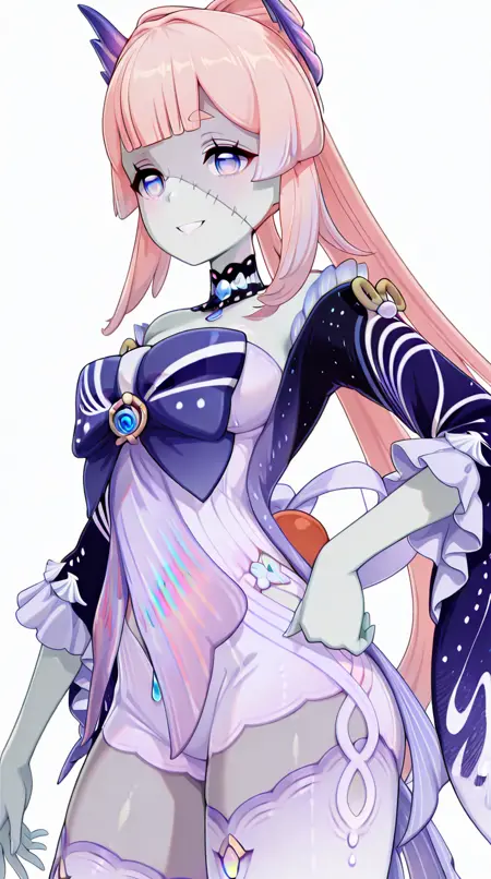 lora:zombie-illustriousxl-lora-nochekaiser:1, zombie, solo, colored skin, stitches, grey skin, multicolored skin, stitched face, zombie pose, halloween, halloween costume,