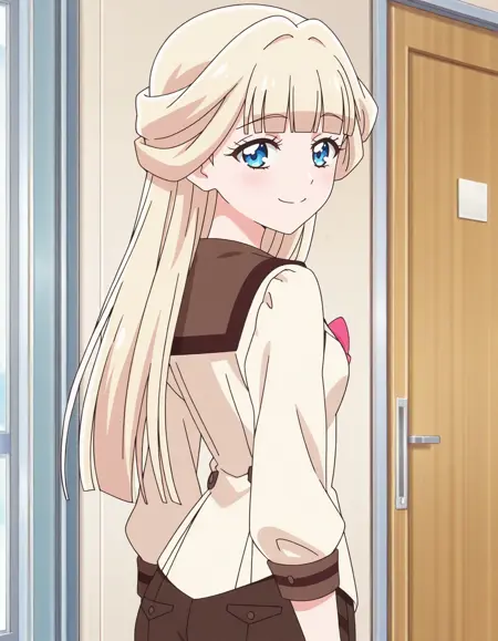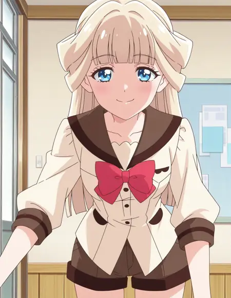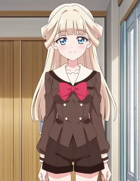 アニメスクリーンキャップ、単体、1人女の子、ねこやしきゆき、yukiwinterschool、制服、茶色のシャツ、白いセーラー襟、短パン、lora:nekoyashikiyuki_IL:0.8、高解像度、素晴らしい品質、最上品質、非常に美的、傑作、absurdres