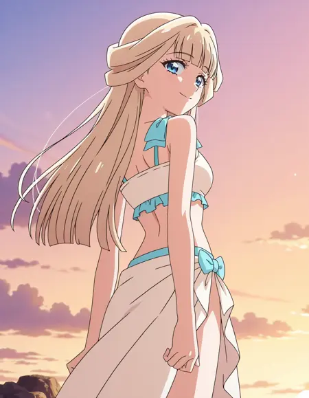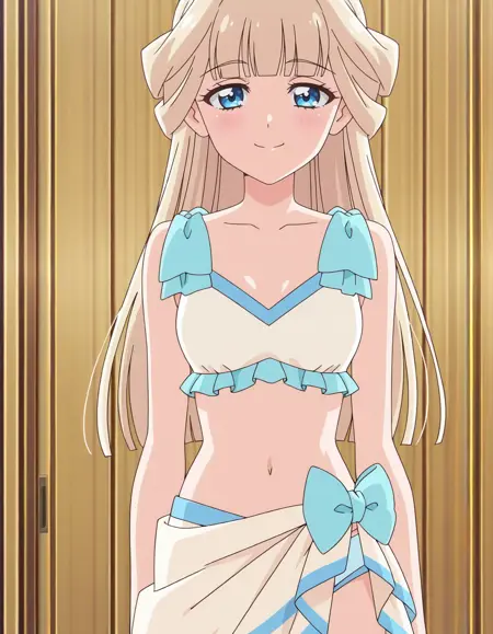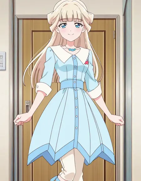 アニメスクリーンキャップ、単体、1人女の子、ねこやしきゆき、yukinormal、青いドレス、カプリパンツ、lora:nekoyashikiyuki_IL:0.8、高解像度、素晴らしい品質、最上品質、非常に美的、傑作、absurdres