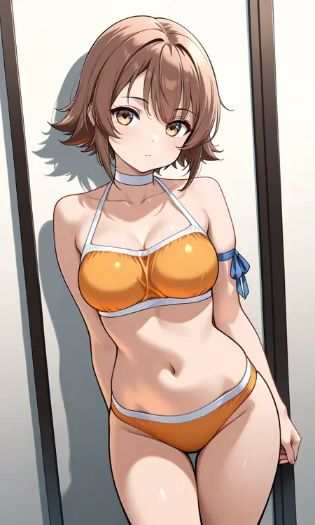 Summer Outfit : richardsummerKC,brown hair,short hair, navel, large breasts, swimsuit, yellow bikini, arm ribbon, orange bikini, collarbone, white choker,