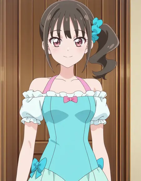anime screencap,solo,1girl,nekoyashikiyukimayu,mayuswimsuit,swimsuit,green skirt,off shoulder,lora:nekoyashikimayu\_IL:0.8, high definition,amazing quality,best quality,very aesthetic,masterpiece,absurdres