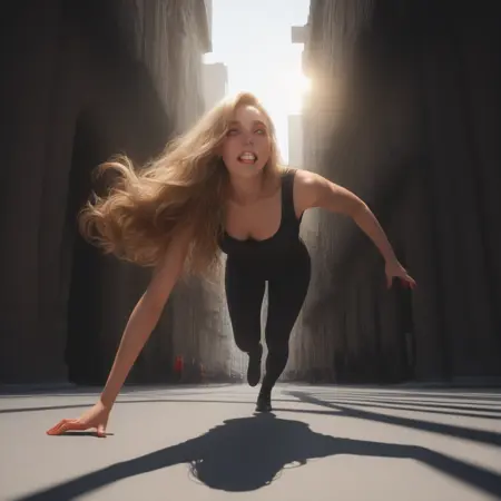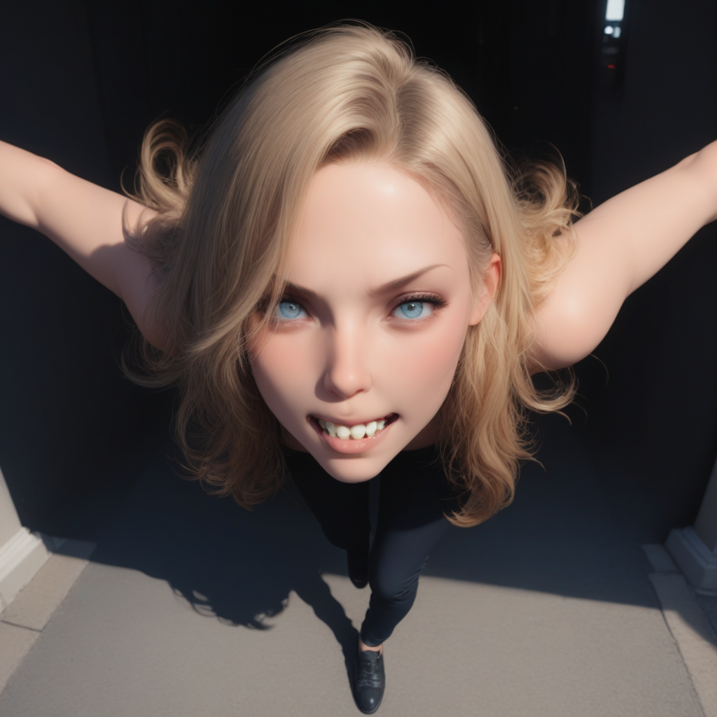 年轻女性,椭圆脸,白皙皮肤,小巧直鼻,浅色眼睛(蓝色或灰绿色),细长微拱的深色眉毛,中等大小嘴唇,上唇轮廓分明,长而直的深棕色头发,中分,修长纤细的脖子,纤细的肩膀,苗条的身材,部分可见的白色整齐牙齿,上中门牙间有自然小缝隙,身穿黑色无袖背心,细项链配小吊坠,中性灰色背景,柔和前光,影棚人像,居中构图
