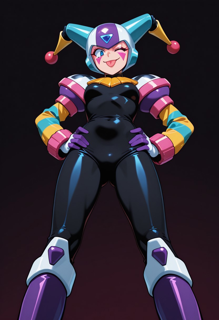 클라운 여성, 파란 눈, 검은 바디슈트, 헬멧, 무릎 부츠, 장갑