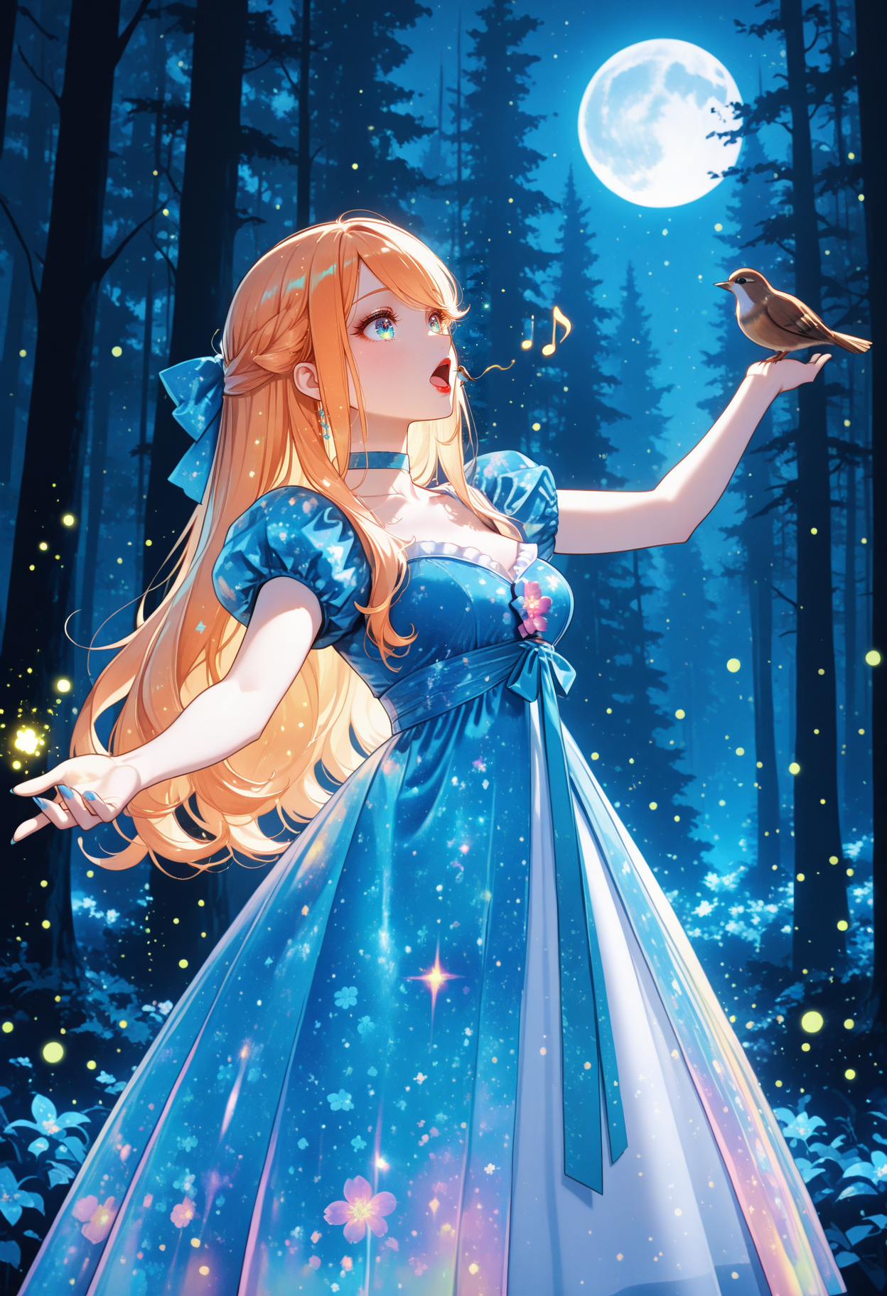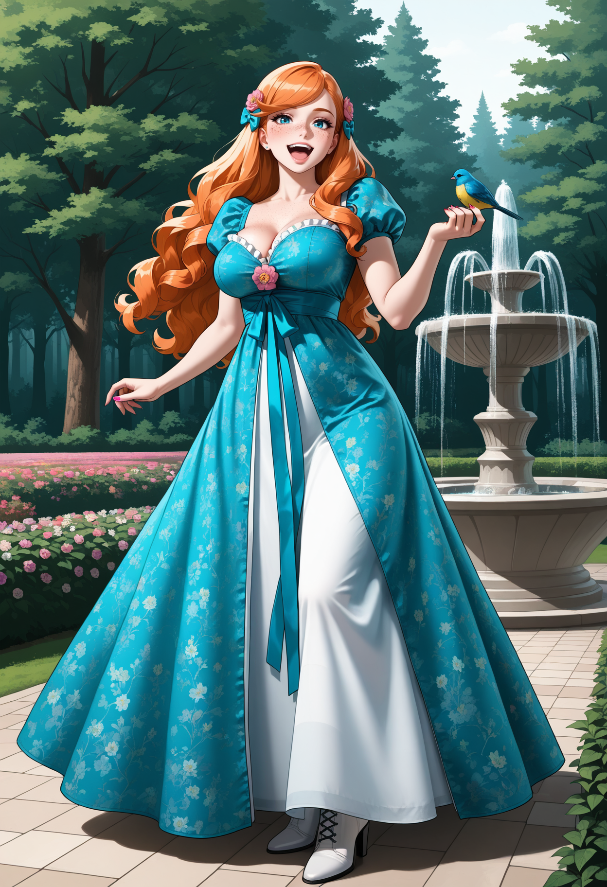 青いドレス、フリル付きの胸元、ふわふわの短い袖、鮮やかなフローラルプリント、白いアンダースカート、青いリボン、ハイウエストドレス、長いリボン、中心の花