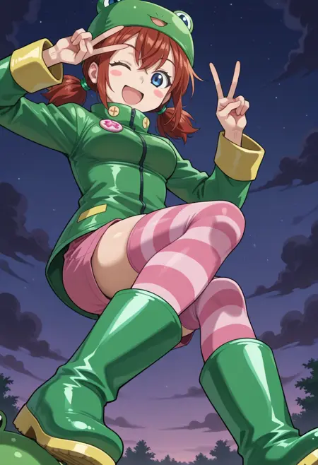 "MCNsR4n4,棕色头发,按钮徽章,青蛙帽子,绿色发带,/长度/头发,蓝色或绿色眼睛,/条纹/粉色长筒袜/膝上袜,绿色夹克,绿色橡胶靴,粉色短裤,腮红贴纸,低双马尾,/尺寸/胸部"