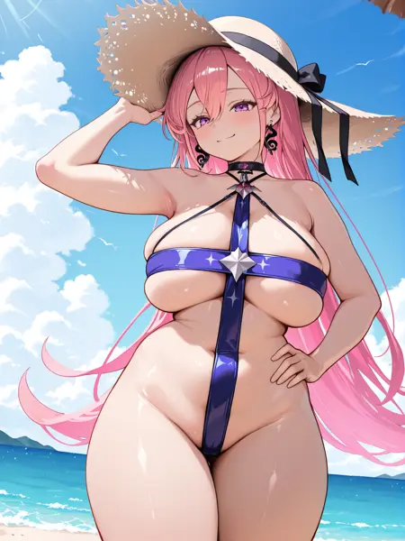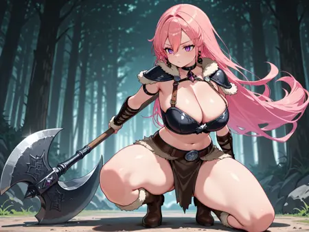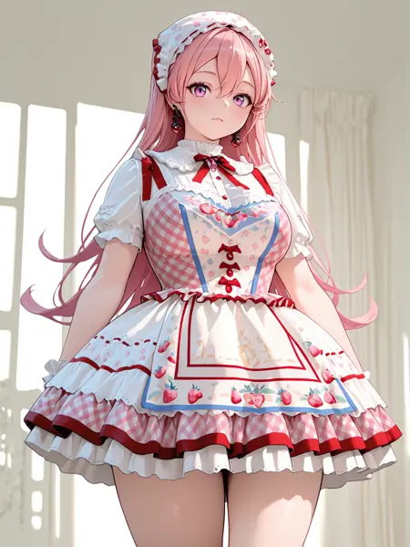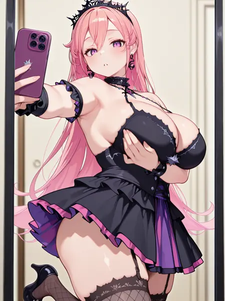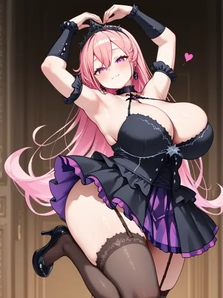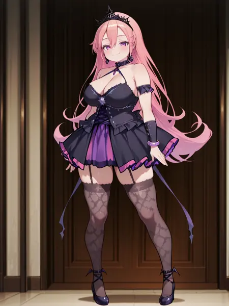 RuRuse, long hair, hair between eyes, pink hair, purple eyes, earrings, large breasts, black tiara, choker, jewelry, cleavage, gothic dress, cross-laced dress, frills, layered skirt, armlet, bracelet, garter straps, lace thighhighs, high heels,