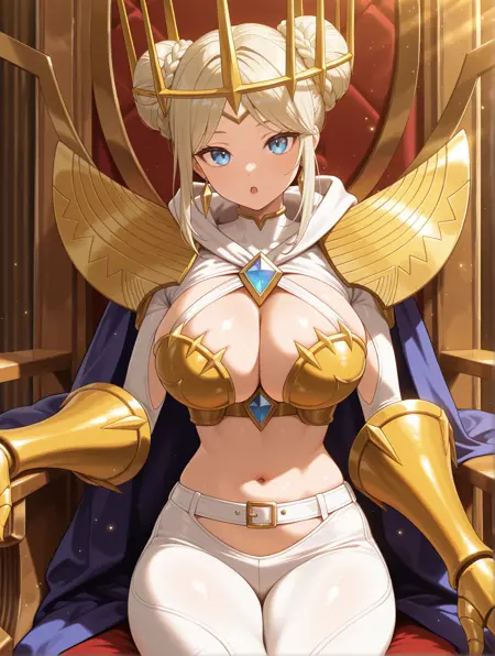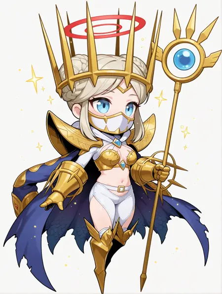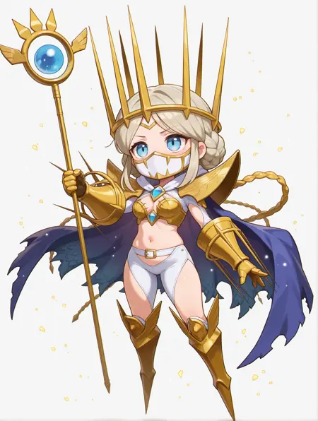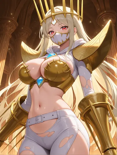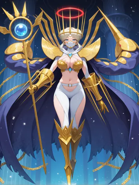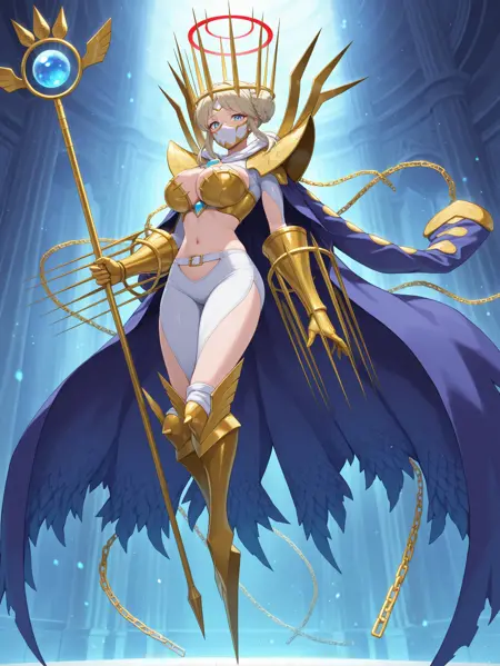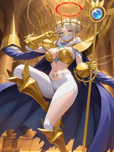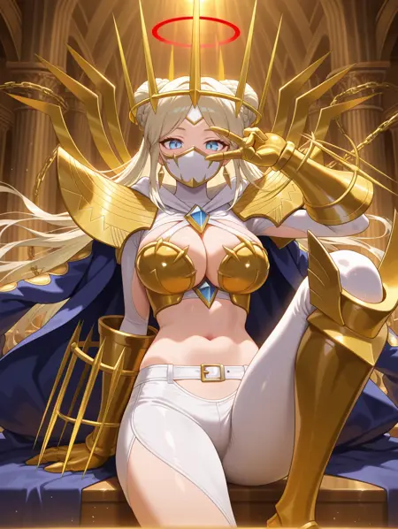 Tags (clothes): chain, red halo, gold crown, covered mouth, white mouth mask, gold earrings, gold shoulder armor, blue cape, white hoodie, gold bikini armor, gold armored gloves, white pants, gold armored boots, no feet, claw \(weapon\),