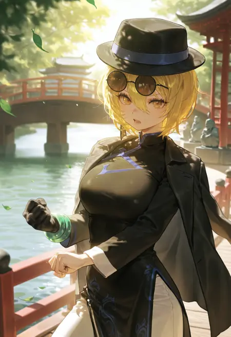 cinq association east uniform, fedora,black hat, round eyewear, sunglasses,eyewear on head, ofuda earrings, single earring, black coat, coat on shoulders, black dress, china dress, black gloves, jade bracelet, single glove, white pants