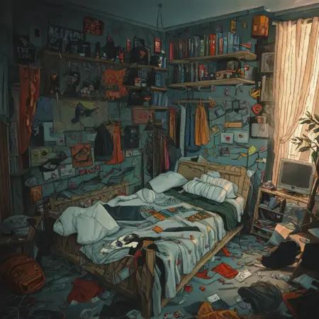 私が生成する画像でいつも清潔な雑誌のような寝室ばかり出てくることに疲れました。これは、散らかった煩雑な寝室を得ようとする試みです。これがうまくいくとは保証できません。