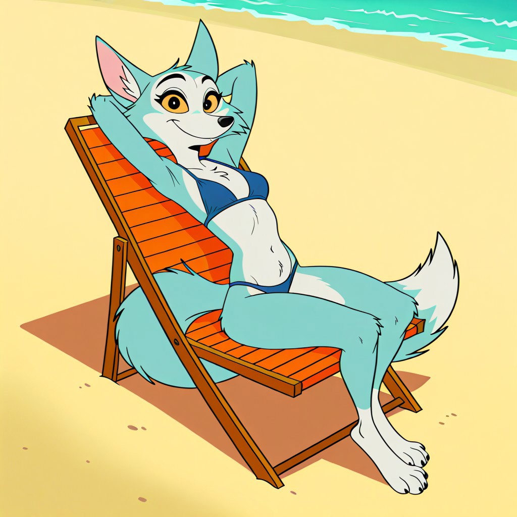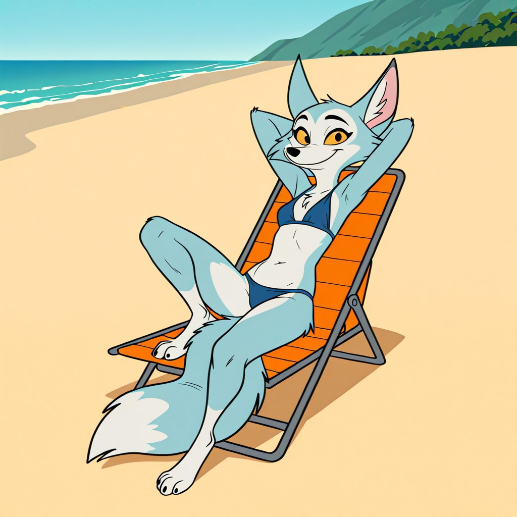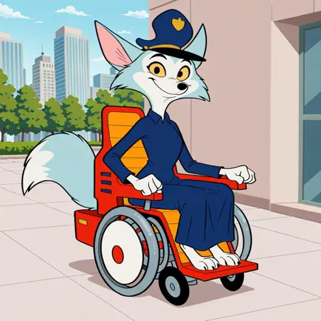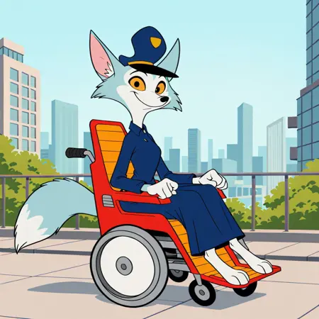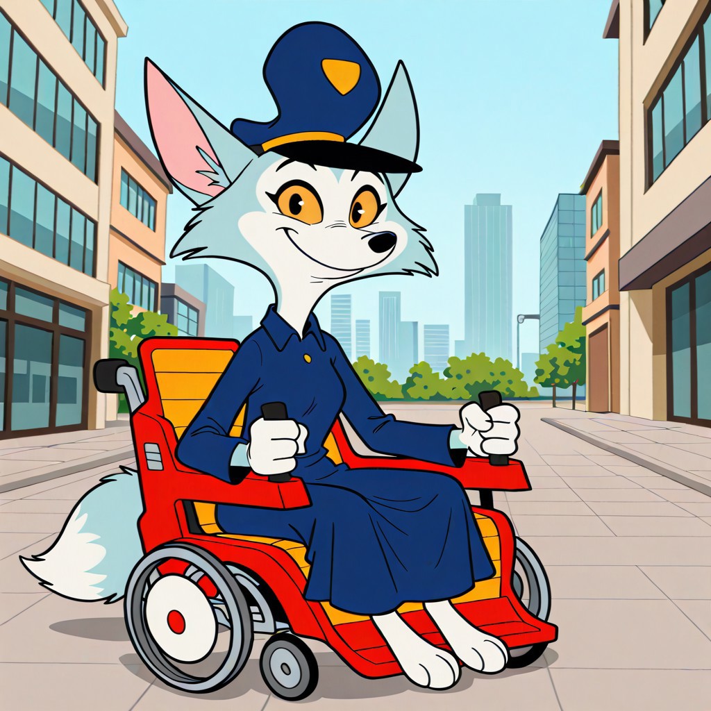 fox, fox girl, blue and gray fur, black pupils, yellow sclera, fox ears, black nose, blue police hat, blue collared dress, motorized wheelchair, sitting,