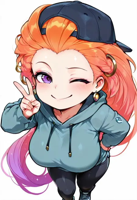Masterpiece, best quality, amazing quality, beautiful eyes, perfect body, perfect hands, hi-res, source_anime, 1girl, solo, Zoe, heterochromia, one purple eye, one green eye, braid, gradient hair, orange hair, multicolored hair, huge breasts, (((shortstack))), mature female,