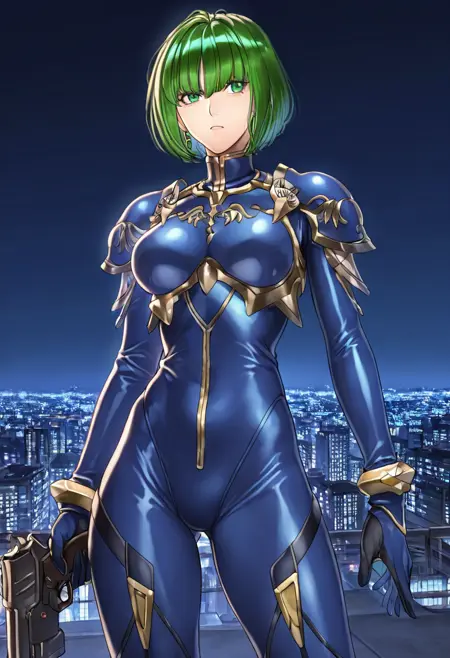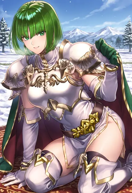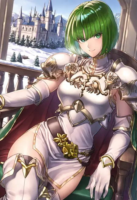 触发词:DithorbaFE,短发,绿发,绿眼,耳环,珠宝,连衣裙,短裙,盔甲,白色盔甲,金色镶边,斗篷,肘套,白色手套,腰带,黑色过膝袜,大腿靴,白色靴子,高跟鞋,