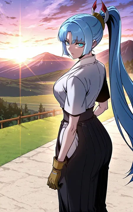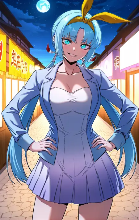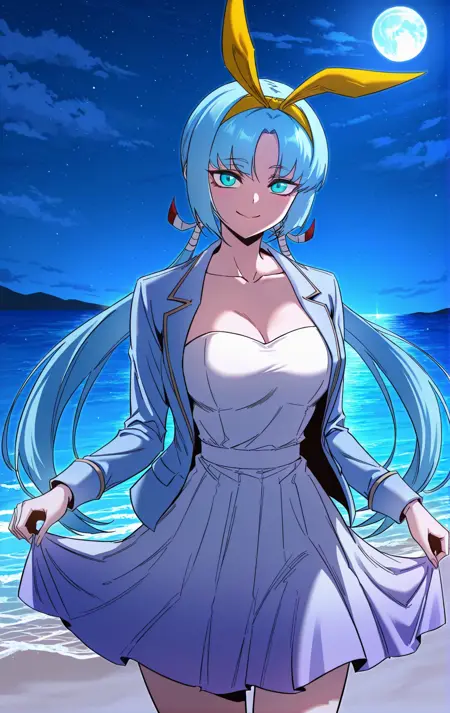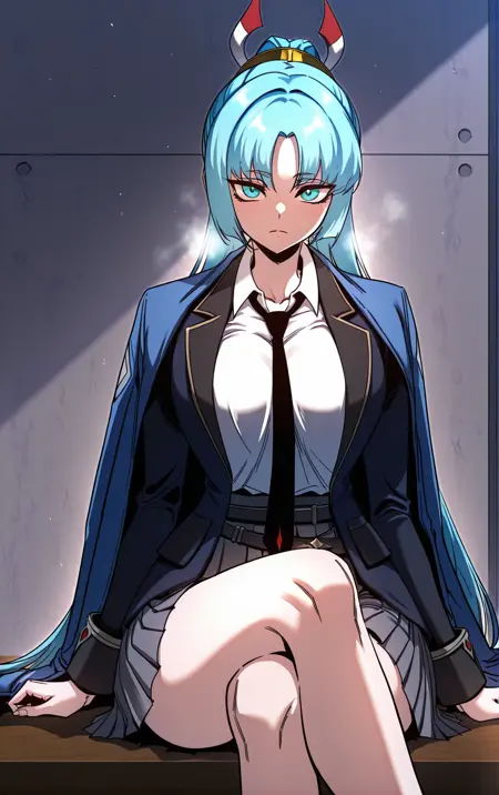 Ryojo, 1girl, solo, 아쿠아 눈, 아쿠아 헤어, 긴 머리, 곧은 앞머리, 갈라진 앞머리, 높은 테일, 옆머리, 비대칭 옆머리, 헤어 액세서리, 금색 머리밴드, 빨간 뿔 액세서리, 뿔 헤드밴드,