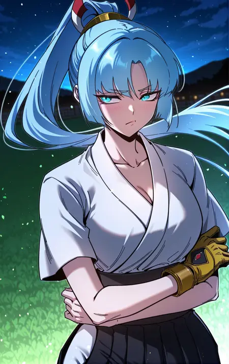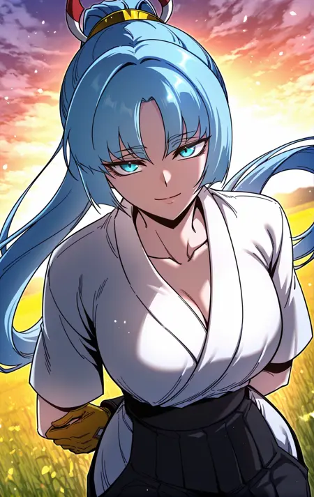 Ryojo_outfit2, 흰색 키모노 상의, 키모노 상의, 가슴 노출, 짧은 소매, 검은 하카마, 주름진 하카마, 옆 절개 하카마, 흰색 속옷, 흰색 내부 키모노 바지, 흰색 양말,