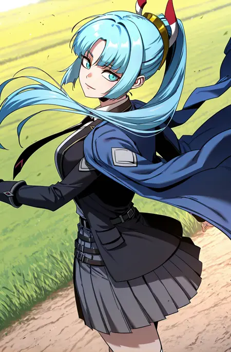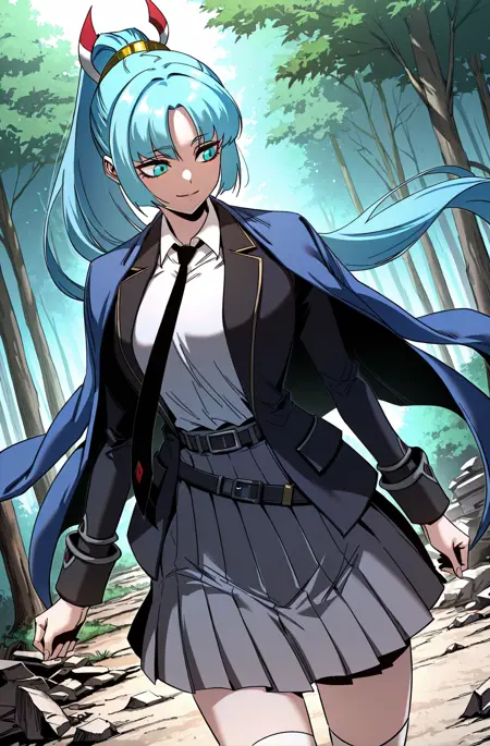 Ryojo_outfit1, 진한 파란색 재킷, 어깨에 걸친 재킷, 검은 블레이저, 금색 트림, 벌어진 블레이저, 긴 소매, 소매 단장, 흰색 셔츠, 검은 넥타이, 주름진 스커트, 회색 스커트, 더블 벨트, 검은 벨트, 흰색 양말, 무릎 양말,