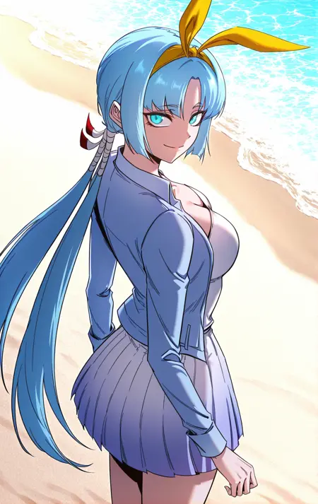 Ryojo, 1girl, solo, 아쿠아 눈, 아쿠아 헤어, 긴 머리, 곧은 앞머리, 갈라진 앞머리, 쌍둥이 테일, 낮은 테일, 옆머리, 비대칭 옆머리, 헤어 리본, 큰 헤어 리본, 토끼 귀 리본,