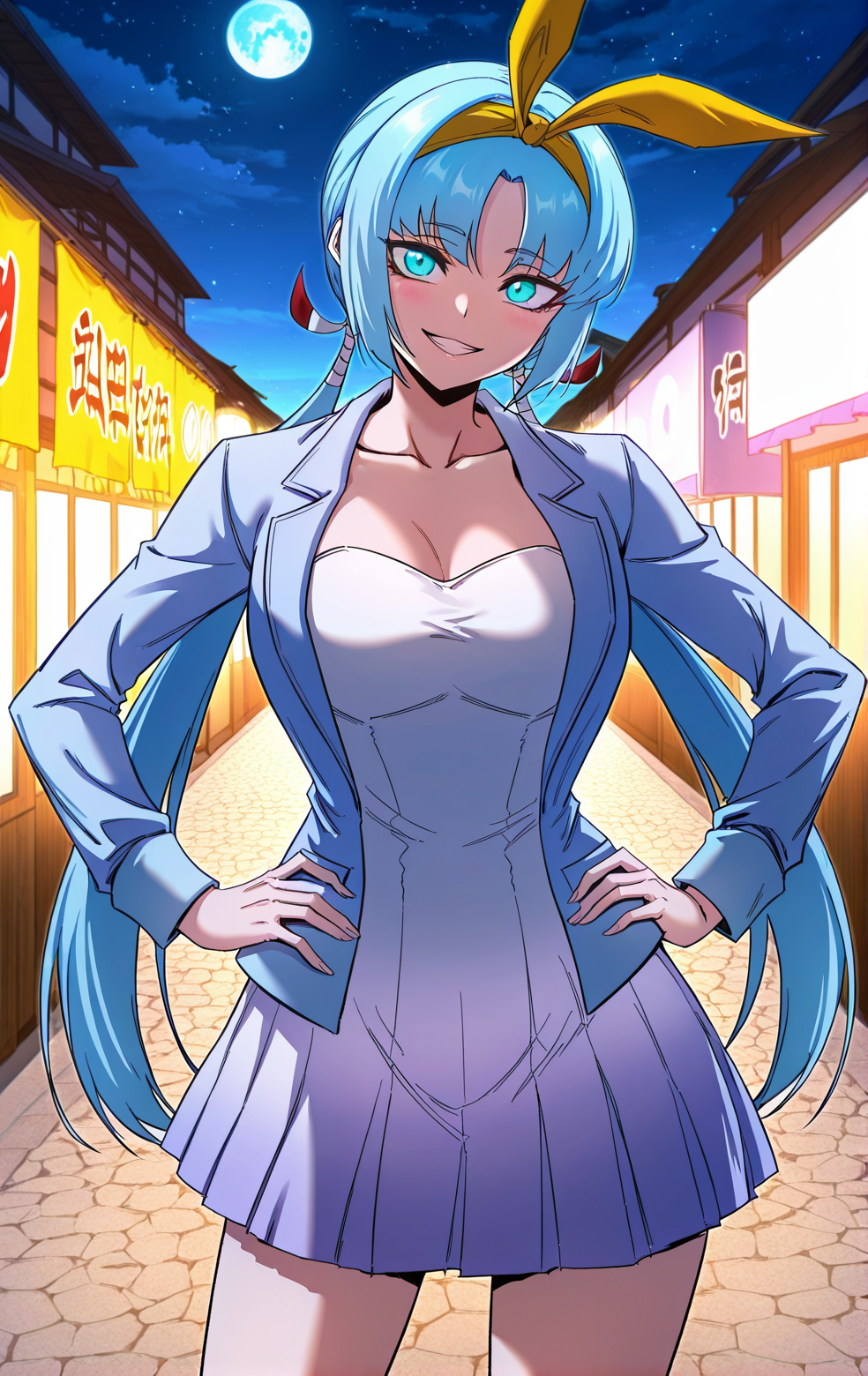 Ryojo_outfit3, 연한 파란색 재킷, 짧은 재킷, 벌어진 재킷, 흰색 드레스, 스트랩리스 드레스, 짧은 드레스, 그라데이션 드레스, 흰색에서 연한 보라색 드레스, 연한 보라색 스커트, 플레어 스커트,