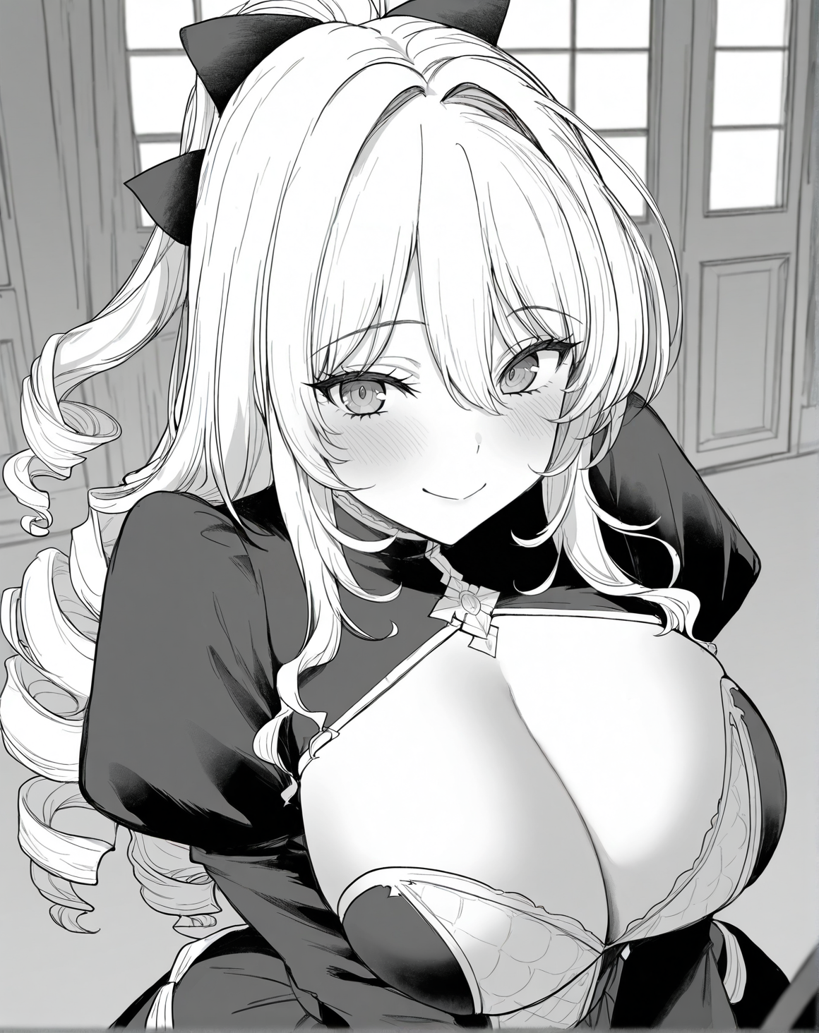 モノクロ、グレースケール、アリカワ、ヘアボウ、ロングヘア、ヘアオーナメント、ドリルヘア、ヘアフローラー、アホ毛、ポニーテール