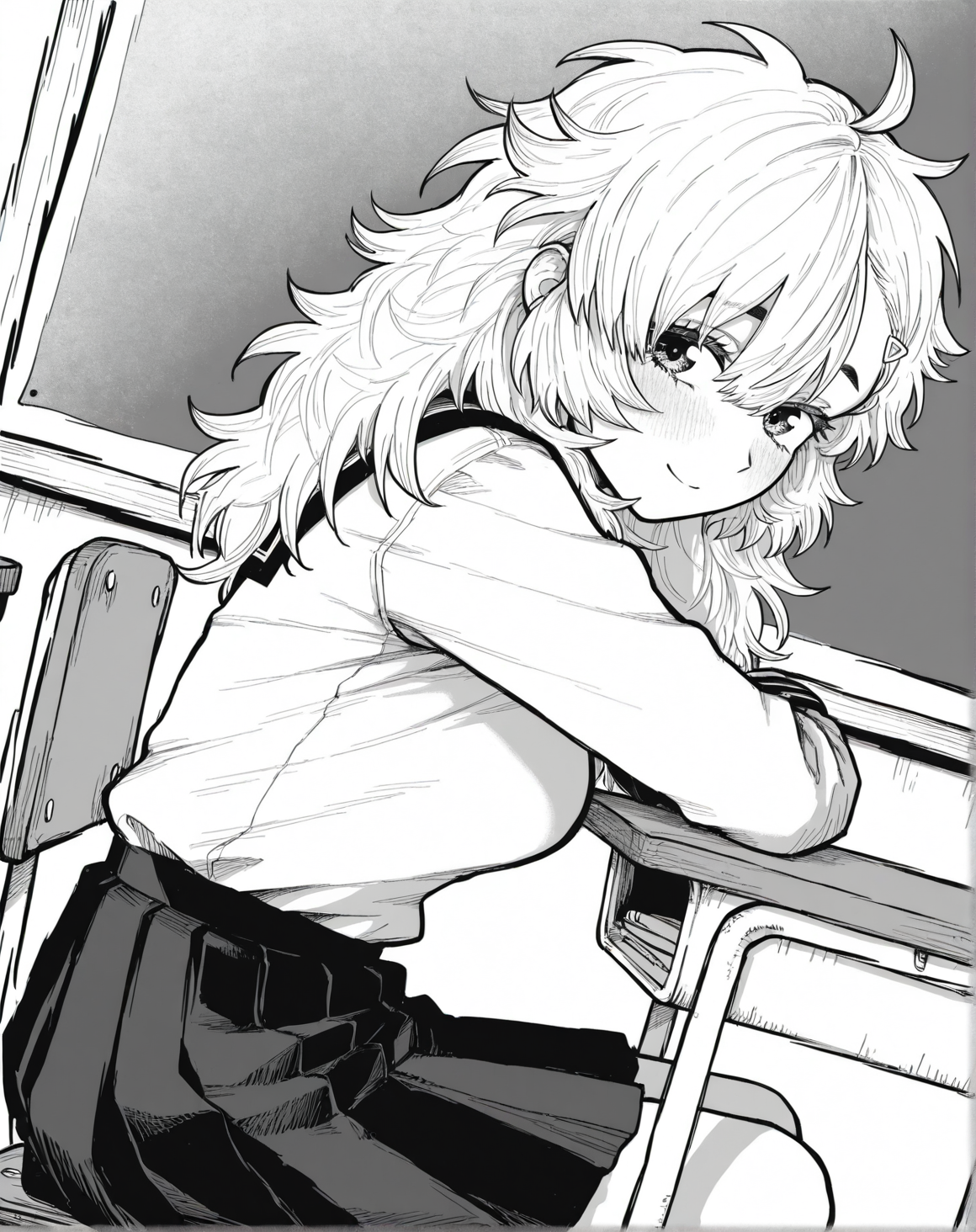 monochrome, greyscale, kodzuruwah, thick eyebrows, hair ornament, hairclip, messy hair, long hair, hair between eyes