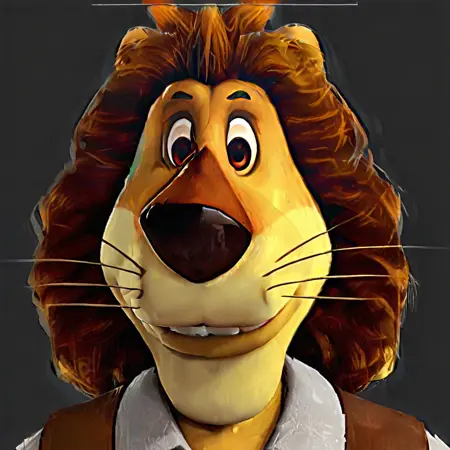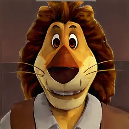 1male, solo, furry, lion, 2 tone fur, very large black lion nose, big teeth, burnt orange eyes, brown lion mane, lion tail, short sleeve white shirt, brown vest, dark red fingerless gloves, wide nose, dark gray pants, belt, whiskers, 4K, thick lower lip,