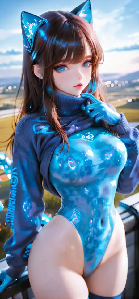 cyber-cat, blue thighhighs, leotard, blue leotard, highleg leotard, sweater, clothes lift, blue gloves, sweater lift