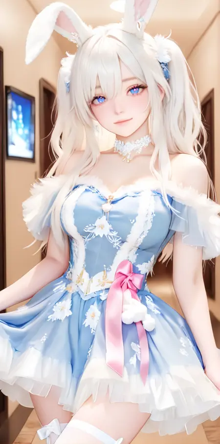 프롬프트 단어: blue_rabbit_dress, dress, white thighhighs, bare shoulders, blue dress, pink bow, off-shoulder dress, skirt hold, white choker