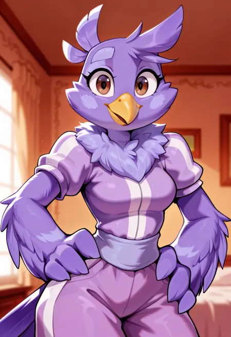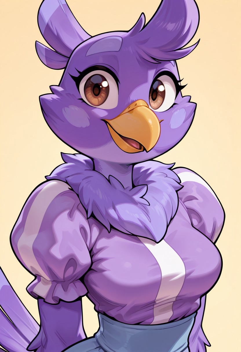 角色外观:梅丽莎·摩根,毛茸茸的女性,鸟类,鸟女孩,紫色羽毛,喙,棕色眼睛