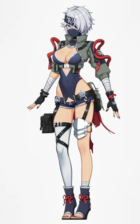 衣装: 黒い靴、足指のない靴、ブーツ、つま先の爪、ネイルポリッシュ、太ももハイズ、片側の太ももハイズ、左右非対称な脚部装備、太ももストラップ、ショートパンツ、短めのショートパンツ、青いショートパンツ、ベルト、ベルトポーチ、手袋、指なし手袋、黒い手袋、カフス、レオタード、青いレオタード、ジャケット、短めのジャケット、開いたジャケット、開いた服、緑のジャケット、ポーチ、包帯、包帯を巻いた腕、包帯を巻いた脚