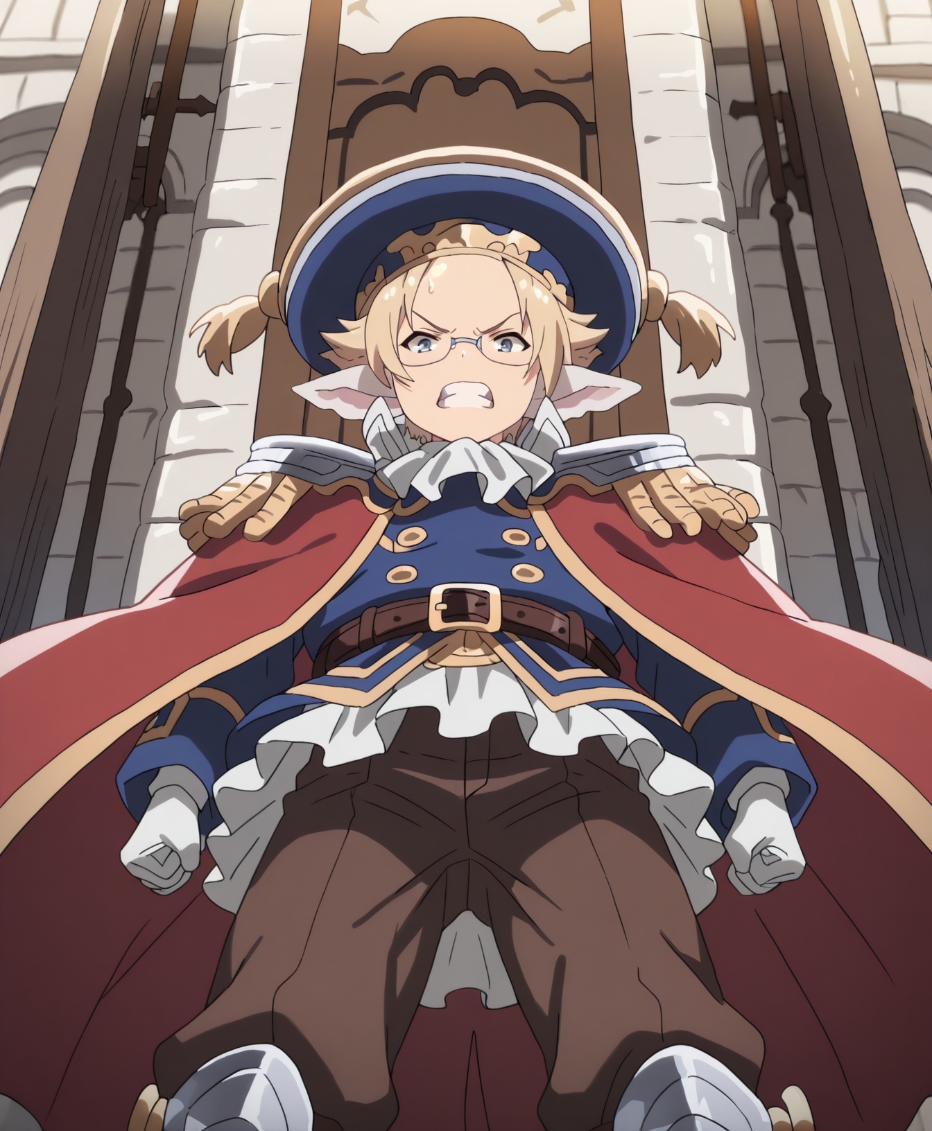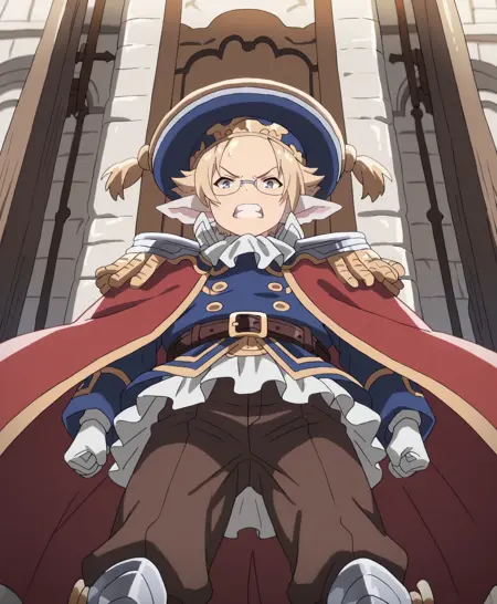 그의 복장: 모자, 빨간 망토, 벨트, 금장식이 있는 파란 코트, 어깨장식, 층층이 이어진 금속 어깨 보호대, 내부에 주름진 흰 레이스 드레스, 갈색 바지, 흰 장갑,