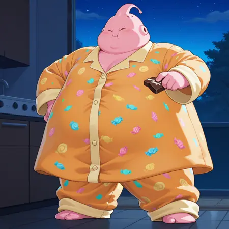 노랑 캔디 프린트 잠옷: buudbfz, 배꼽 없음, 분홍 피부, 뚱뚱함, 분홍 안테나, 구멍(해부학), 노랑 및 주황 잠옷, 캔디 프린트, 눈 감음, 눈썹 없음