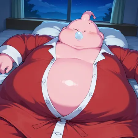 빨간 잠옷: buudbfz, 배꼽 없음, 분홍 피부, 뚱뚱함, 분홍 안테나, 구멍(해부학), 빨강 및 흰 잠옷, 눈 감음, 눈썹 없음