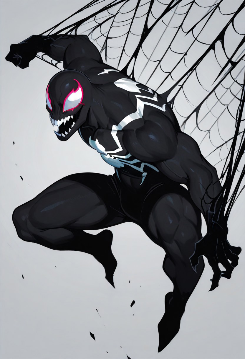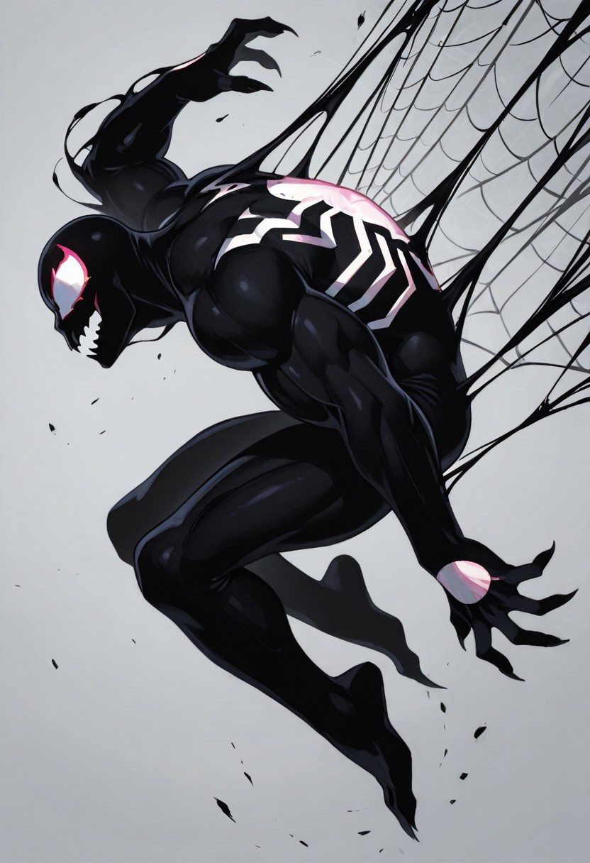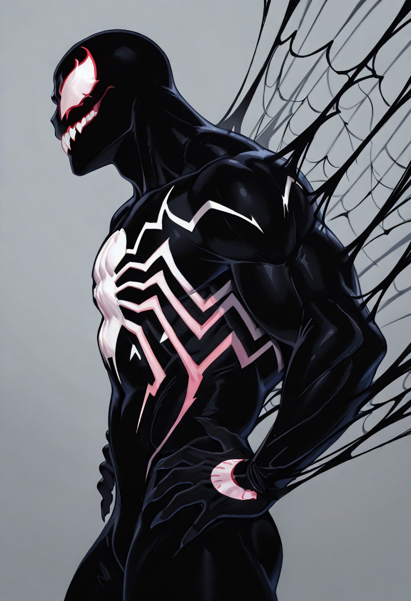 spidershadowsXL, symbiote, black suit, body suit, 1boy, solo, muscular, spider print,