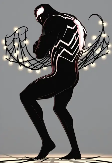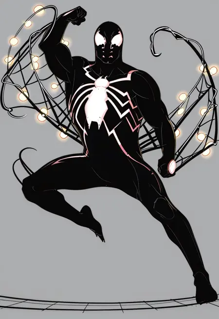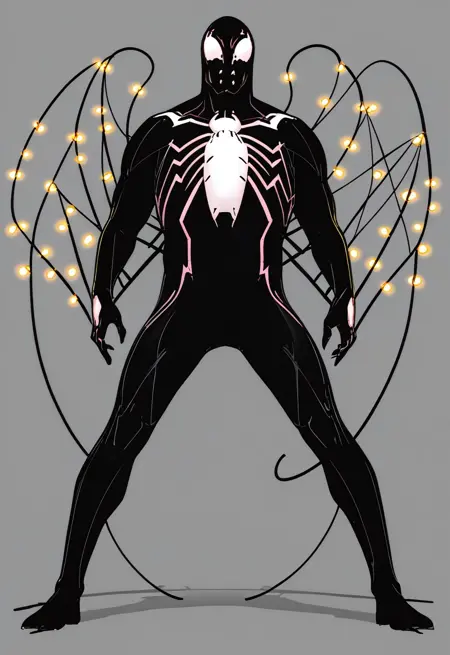 spidershadowsXL, symbiote, black suit, body suit, 1boy, solo, muscular, spider print,