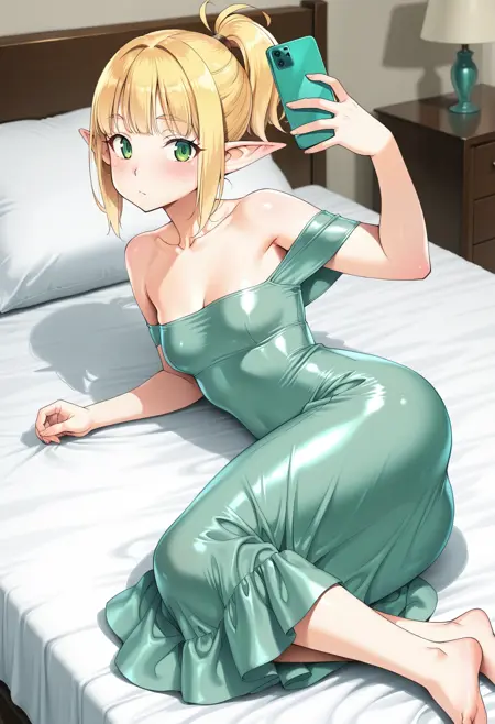 Trigger word: m3rm31ddr3ss,long dress,mermaid dress,assymmetrical skirt,off shoulders dress,short sleeves,collarbone,satin dress,strapless dress,pleated skirt,