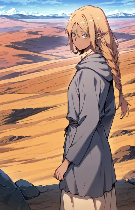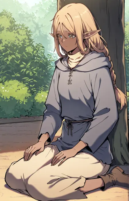 シャイレン、1 Girl、単体、エルフ、尖った耳、濃い肌、ダークエルフ、薄茶色の目、濃い金髪、長い髪、中央分けの前髪、目の間に髪が垂れ下がっている、サイドロックス、編み込んだポニーテール、低い編み髪、ほつれた髪の毛、
