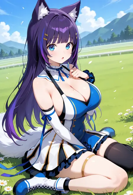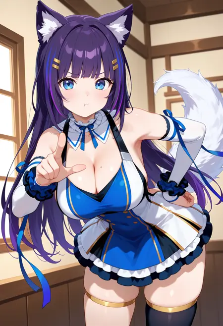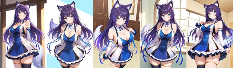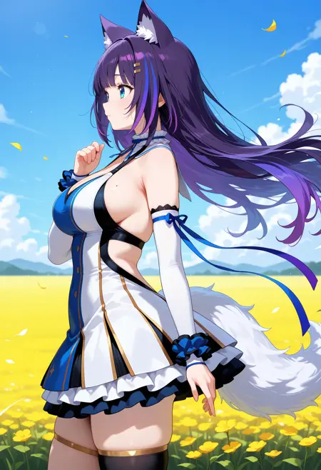 outfit1aakokoro, long hair, multicolored hair, purple hair, animal ears, hair ornament, tail, blue eyes, mole on breast, detached collar, neck ribbon, multicolored dress, detached sleeves, blue ribbon, single thighhigh, thigh strap, black thighhighs