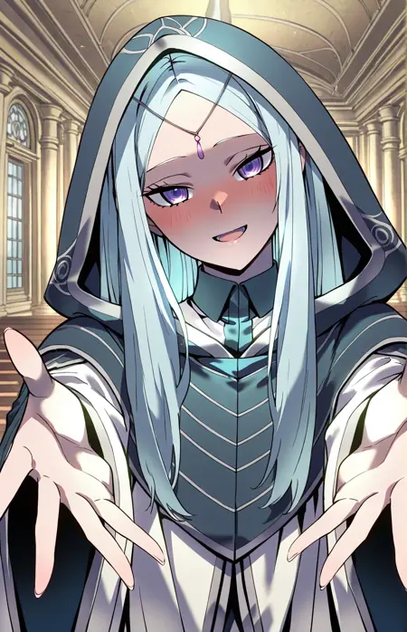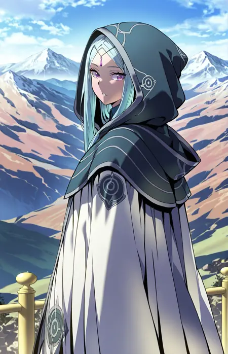 Cereline_outfit1, dark blue hood, silver trim hood, large hood, white cloak, long cloak, circular emblem, layered outfit, white outer robe, high collar, dark blue collar, long sleeves, wide sleeves, dark blue inner robe, long inner robe,