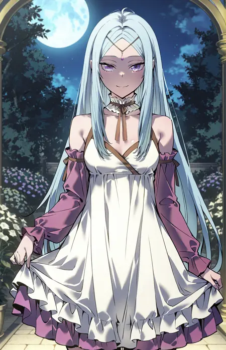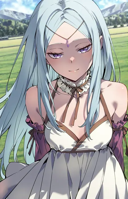 Cereline, 1girl, solo, purple eyes, light blue hair, long hair, straight hair, center parted bangs, long sidelocks, loose hair, head ornament, forehead jewel, purple forehead jewel, small breasts,