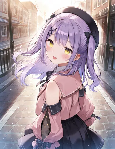 shinomiya-runa,purple_hair,yellow_eyes,virtual youtuber, purple hair,hat,two side up,skirt,black bow,black skirt,bow,blush,shirt,beret,long hair,long sleeves,black headwear,bangs,pink jacket,collared shirt,hair bow,detached sleeves,