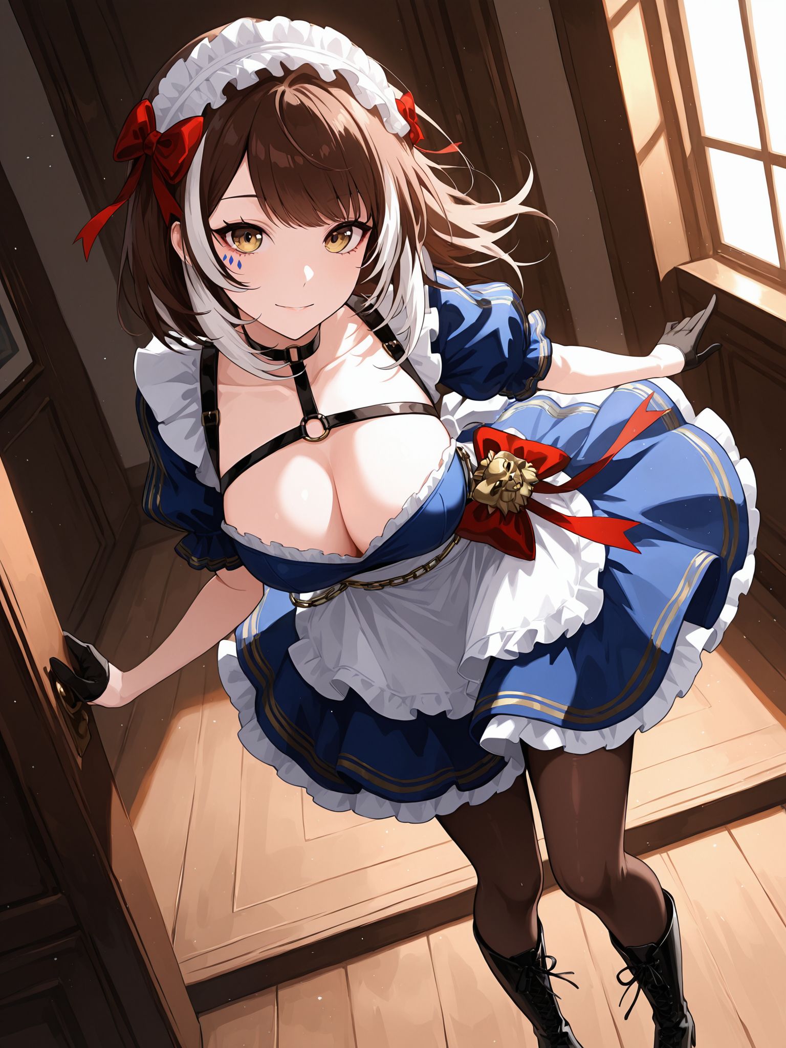 | トレーニングワード | taktoparlesienne,medium hair,multicolored hair,streaked hair,brown hair,white hair,brown eyes,yellow eyes,facial mark,maid headdress,hair bow,red bow,large breasts,コピーしました! blue dress,puffy short sleeves,black choker,o-ring chokercriss-cross halter,half gloves,black gloves,apron,chain,frills,brown pantyhose,black footwear,lace-up boots,コピーしました! |