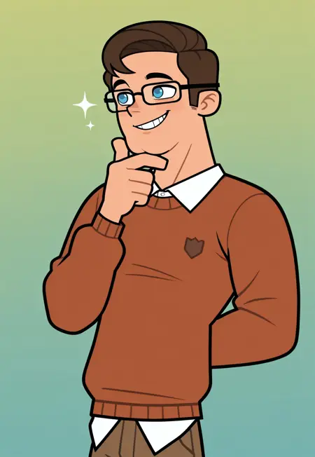 b3nj1, brown hair, short hair, side part hair style, blue eyes, glasses