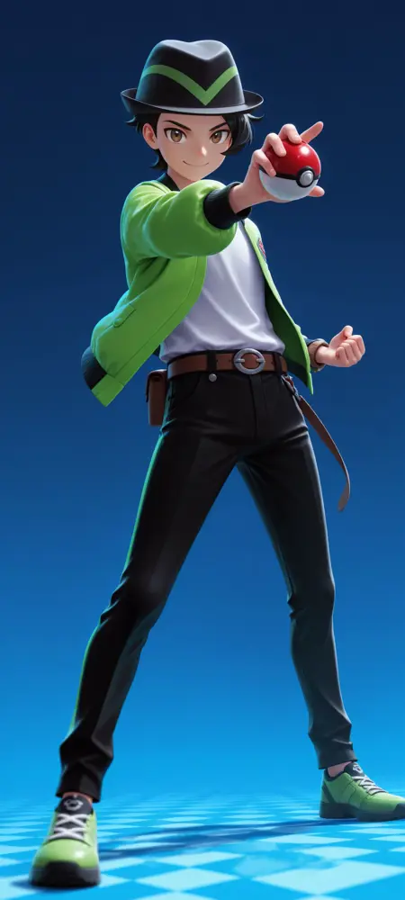 帕克顿,黑发,短发,棕眼,黑色头饰,帽子,白衬衫,绿色夹克,腰带,黑裤子,鞋子,
