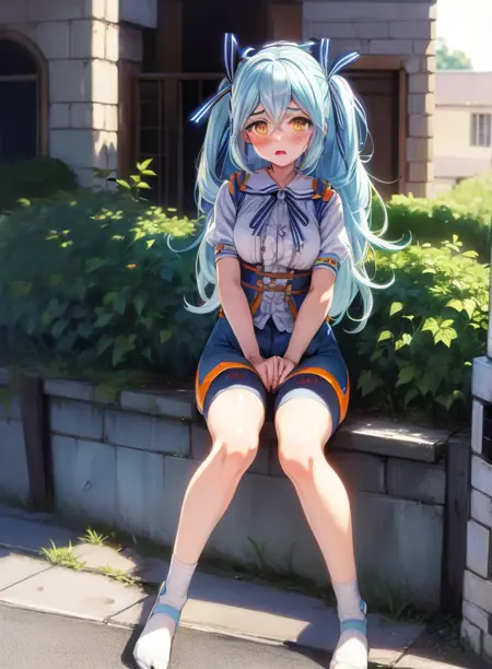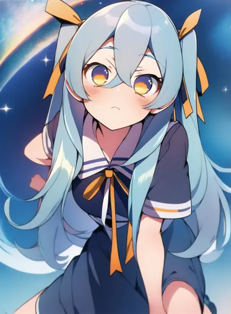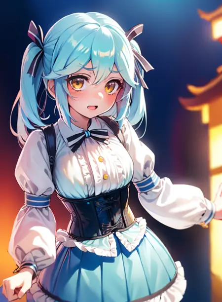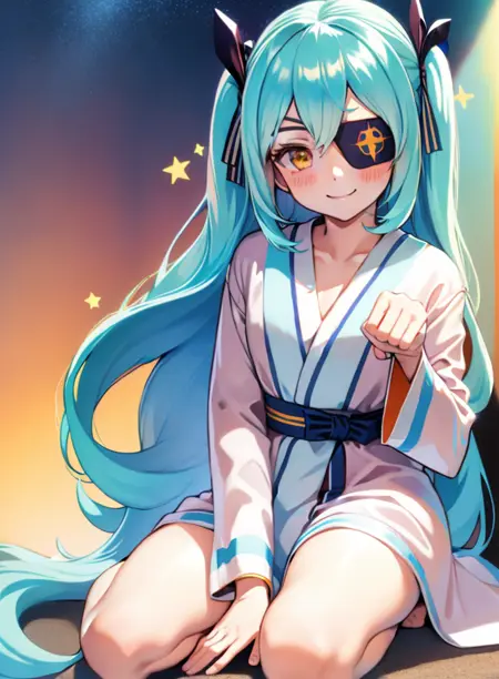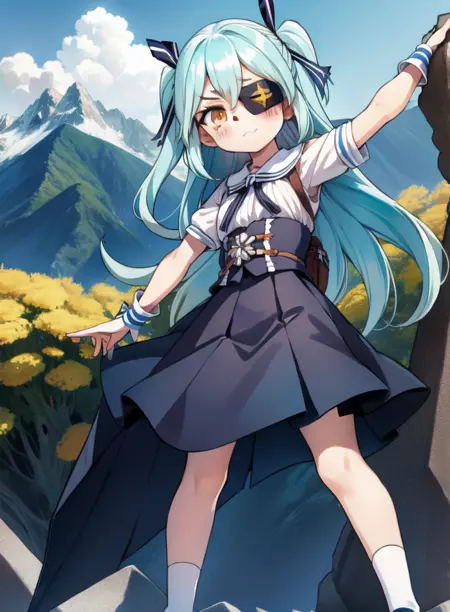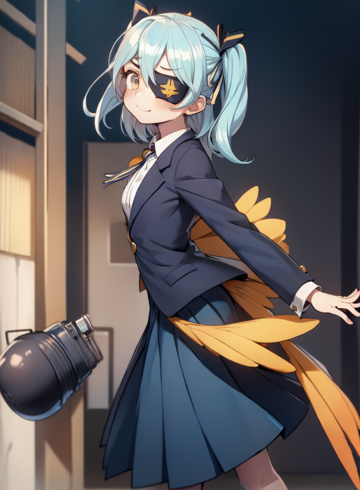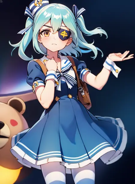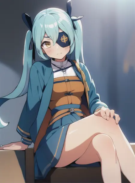 外見: 1girl、ツインテール、青髪、黄色い目、頬赤、髪リボン、中くらいの髪、薄青髪、オレンジ色の目、前髪、両サイドアップ、アイパッチ