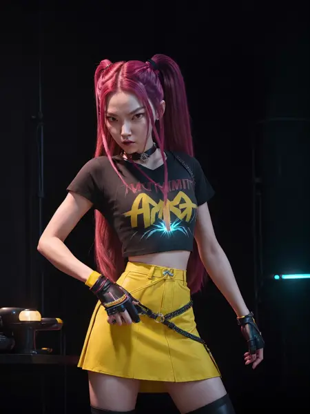 photo of M1r4_Huntr1x, woman, asian, korean, 23 years old, pink hair, twin ponytails, black tshirt, black choker, yellow skirt, fingerless gloves, black boots, ultra realistic