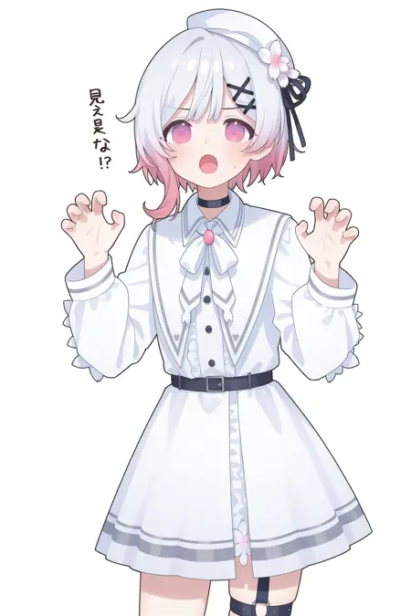 sakuraba ema, hat, flower, pink hair, 1girl, hair ornament, pink eyes, black headwear, multicolored hair, white hair, beret, hair flower, white shirt, long sleeves, shirt, black footwear, white flower, virtual youtuber, fang, gradient hair, socks